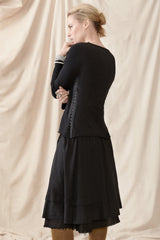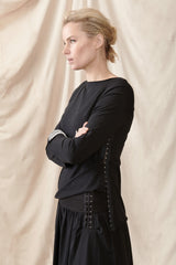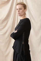 The Elm top is made from sustainable hemp and organic cotton with a touch of spandex for fit and comfort.  You can adjust the look by closing the hooks and eyes, or leaving them half open for a playful look, alternatively you can hook the lower hooks onto the top eyes for a stylish front detail
